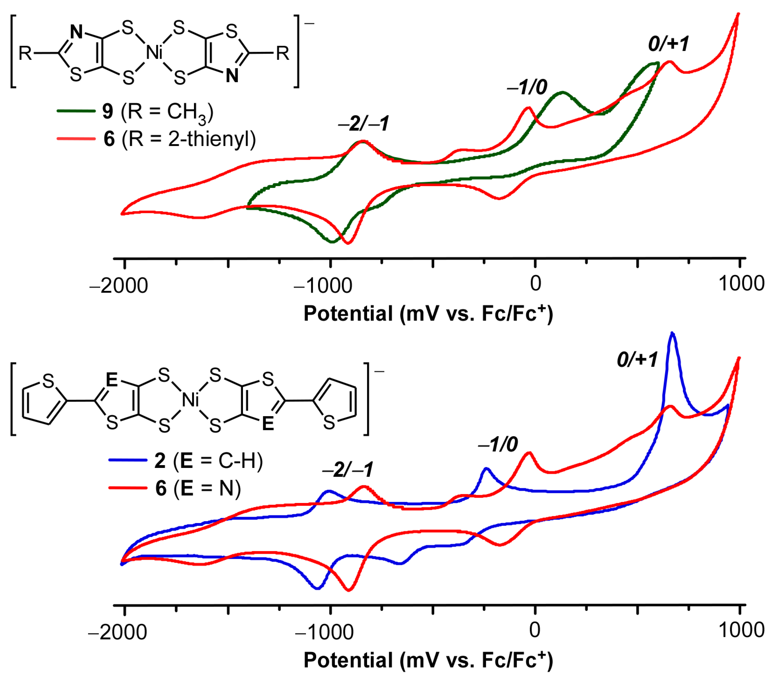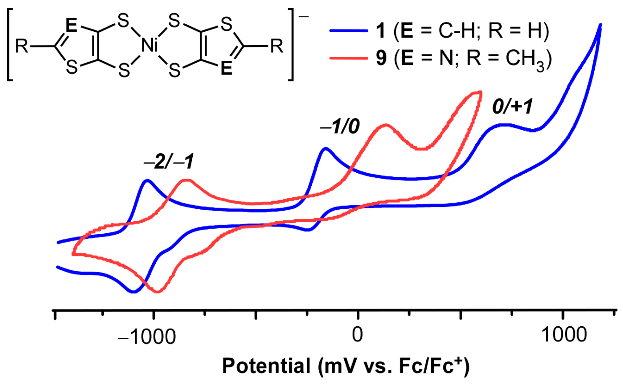 - Uzelac, E.J.; Rasmussen, S.C. Thiophene-Extended Nickel Thiazoledithiolene: π-Extended Fused-ring Metal Dithiolenes with Stabilized Frontier Orbitals. Eur. J. Inorg. Chem. 2017, 2017, 3878–3883. [Google Scholar] [CrossRef]