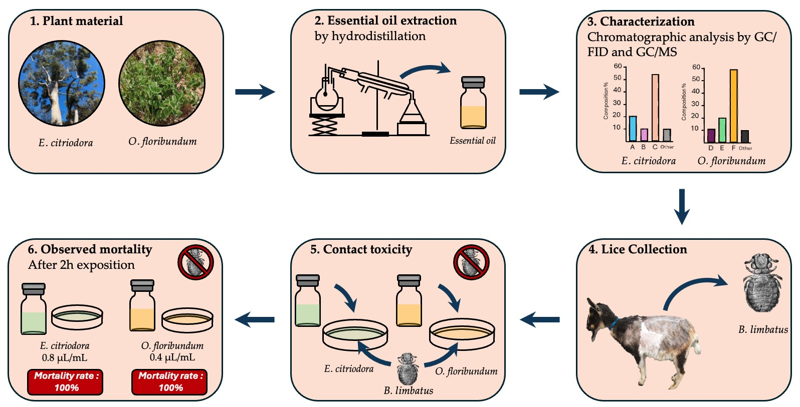 Chikhi-Chorfi, N.; Haddadj, F.; Djellout, B.; Zenia, S.; Hazzit, M.; Marniche, F.; Milla, A.; Smai, A. Chemical Composition and Insecticidal Activity of Essential Oils from Origanum floribundum and Eucalyptus citriodora Against the Louse Bovicola limbatus. Molecules 2025, 30, 4001. https://doi.org/10.3390/molecules30194001