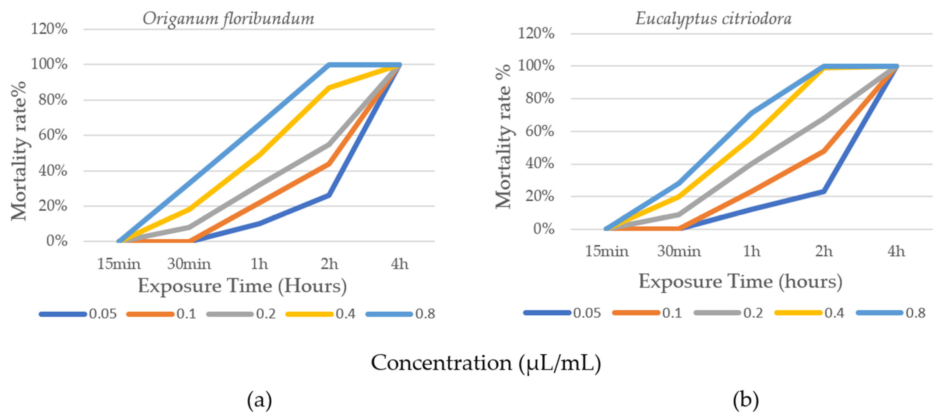 | Tested EO | C * (μL/mL) | Mean Mortality Rates (%, ±SD) at Different Treatment Times | ||||