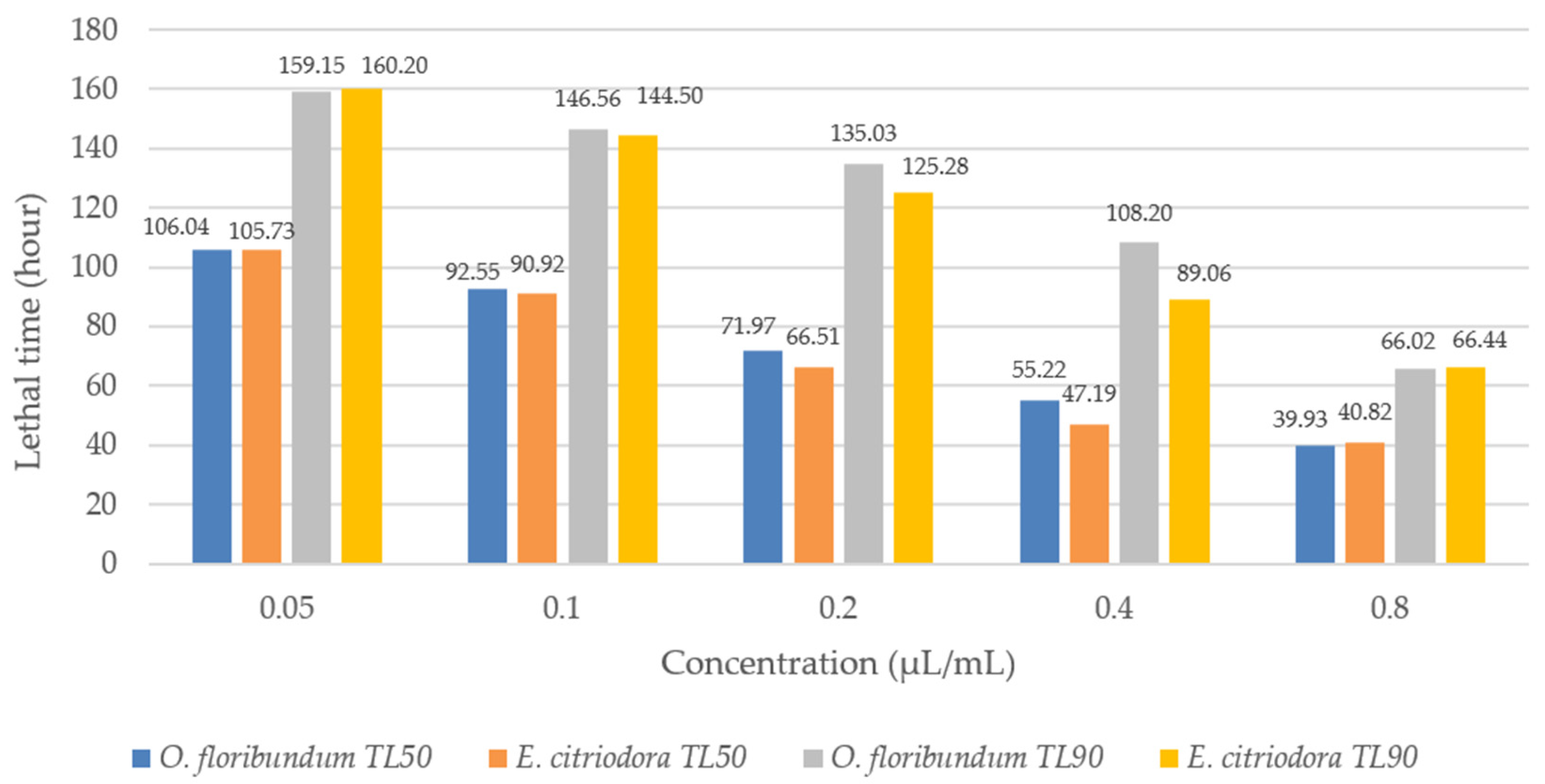 | Concentration EO of Eucalyptus citriodora (μL/mL) | LT50 | r | LT90 | r |