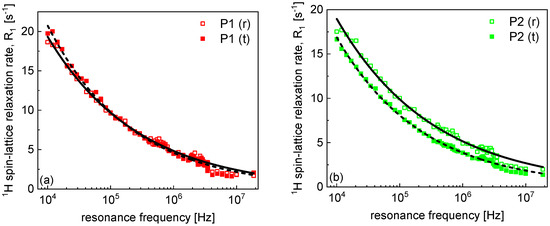 Figure 2a includes a comparison of the 1H spin–lattice relaxation rates obtained for all cases. The relaxation rates converge at higher frequencies, showing significant differences in the low frequency range. Therefore, it is of interest to discuss relative changes in the spin–lattice relaxation rates in a specified frequency range, from to , focusing on low frequencies. The relative change (decreasing) of the 1H spin–lattice relaxation rates is given by a parameter . As far as the frequencies are concerned, = 10 kHz and = 100 kHz have been chosen to cover one order of magnitude in the low frequency range (Figure 2b).