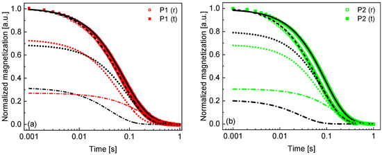 The 1H spin–lattice relaxation data collected by means of FFC-NMR relaxometry are shown in Figure 1 for the individual patients. The data obtained for the pathological samples are denoted as open symbols, and the index “(t)” (for instance, “P5 (t)”, denotes patient 5, tumor sample), while the data for the peri-tumoral (reference) samples are represented by solid symbols and the index “(r)”. The data sets also include the spin–lattice relaxation rates at 18.7 MHz. The spin–lattice relaxation process has turned out to be single exponential—the corresponding magnetization curves (1H magnetization versus time) are presented in the Supplementary Materials, Figures S1 and S2.