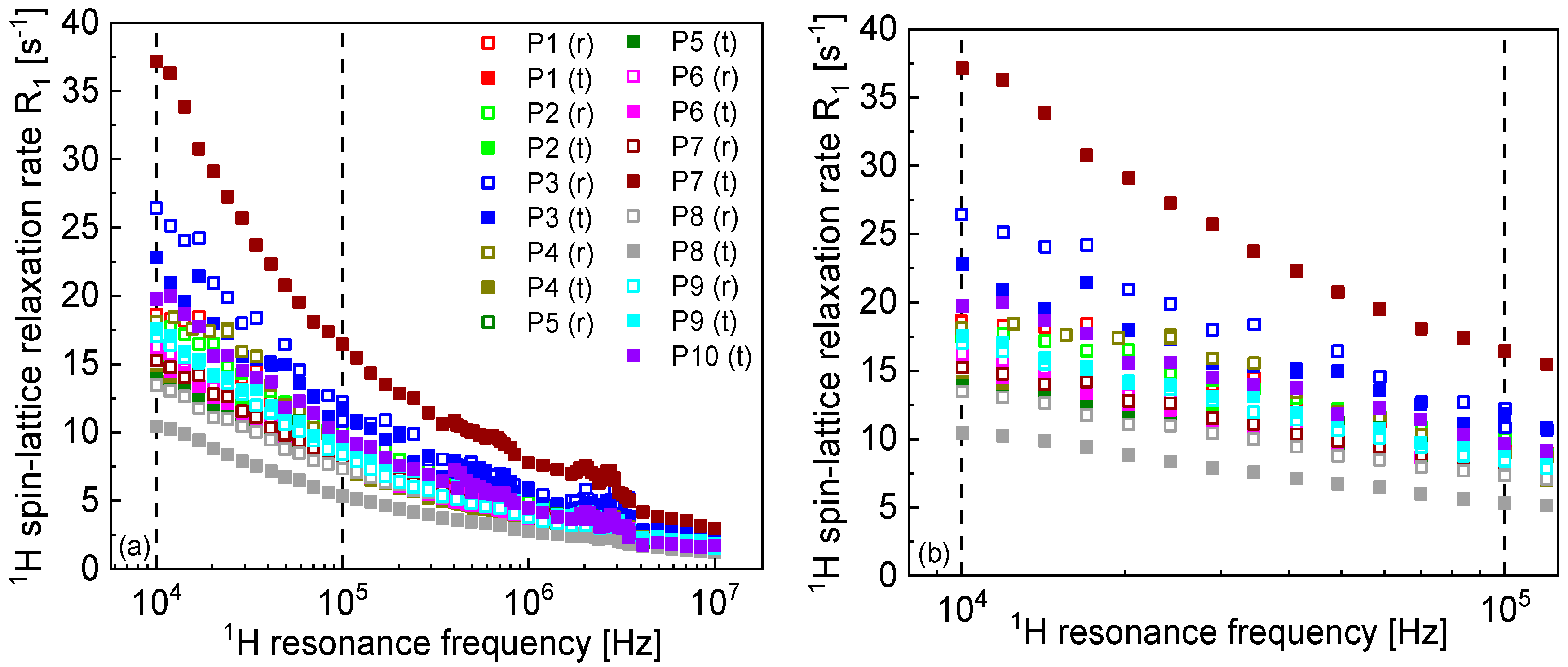 - Parigi, G.; Ravera, E.; Fragai, M.; Luchinat, C. Unveiling protein dynamics in solution with field-cycling NMR relaxometry. Prog. Nucl. Magn. Reson. Spectrosc. 2021, 124–125, 85–98. [Google Scholar] [CrossRef]