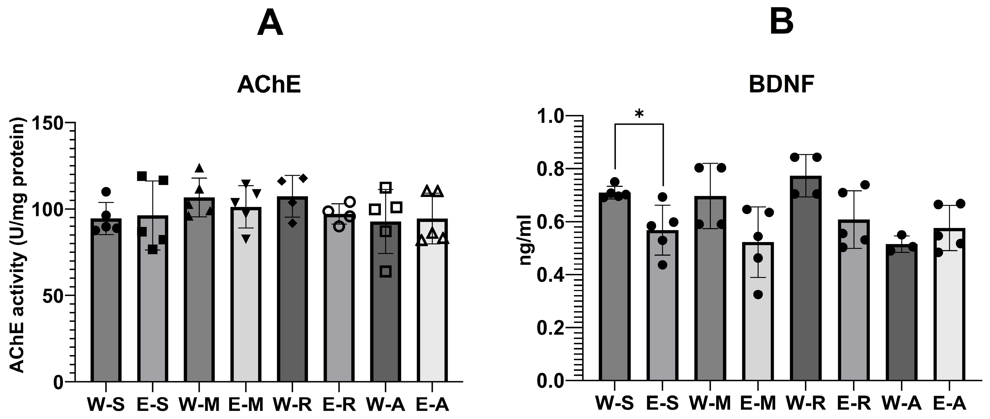 - Silva-Peña, D.; García-Marchena, N.; Alén, F.; Araos, P.; Rivera, P.; Vargas, A.; García-Fernández, M.I.; Martín-Velasco, A.I.; Villanúa, M.Á.; Castilla-Ortega, E.; et al. Alcohol-induced cognitive deficits are associated with decreased circulating levels of the neurotrophin BDNF in humans and rats. Addict. Biol. 2019, 24, 1019–1033. [Google Scholar] [CrossRef]