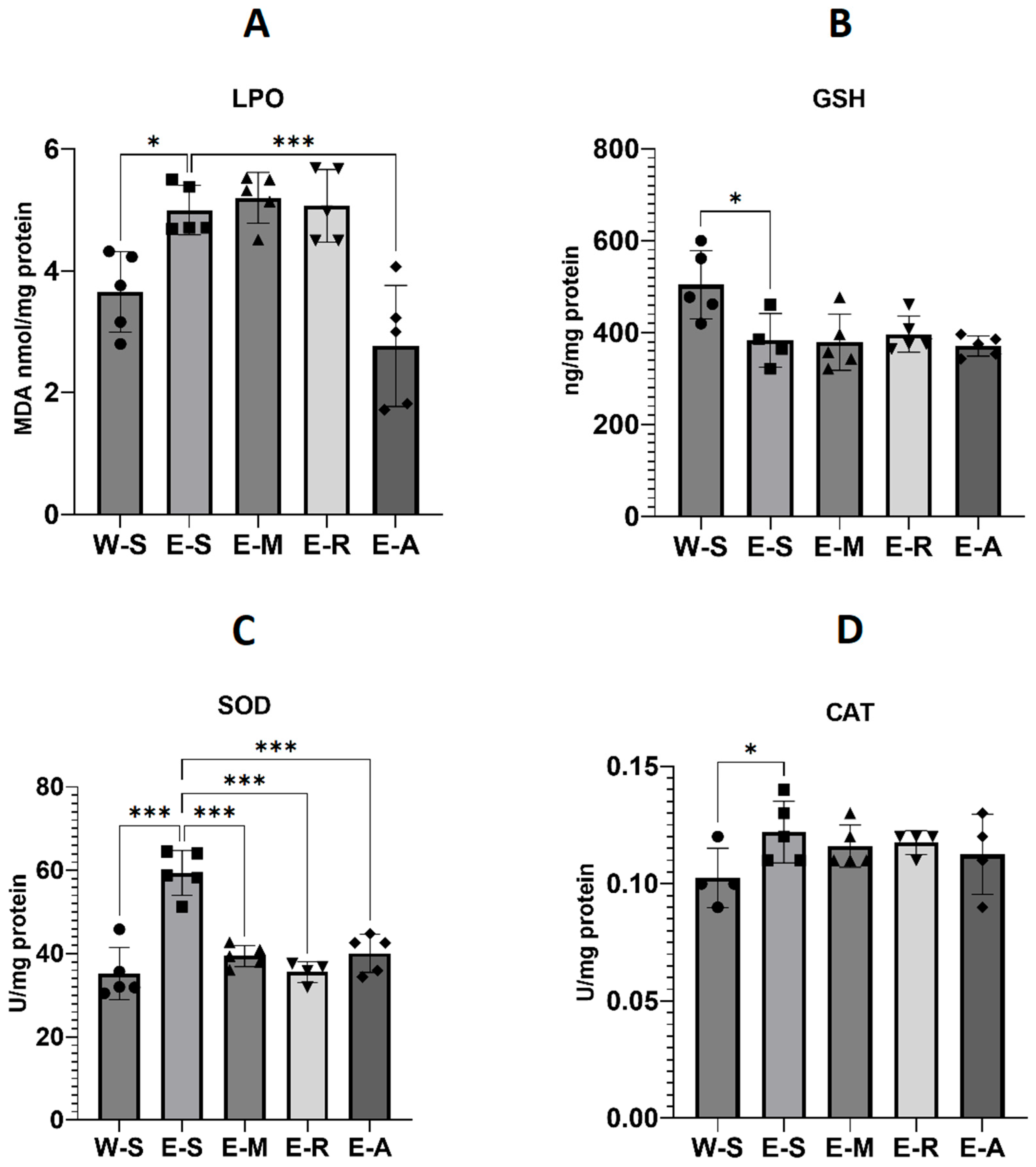 Lipid peroxidation (LPO), nicotinamide adenine dinucleotide phosphate oxidase (NOX), superoxide dismutase (SOD), and catalase (CAT) activities → ↑ formation of reactive oxygen species (ROS) | ↑ | ↓ |