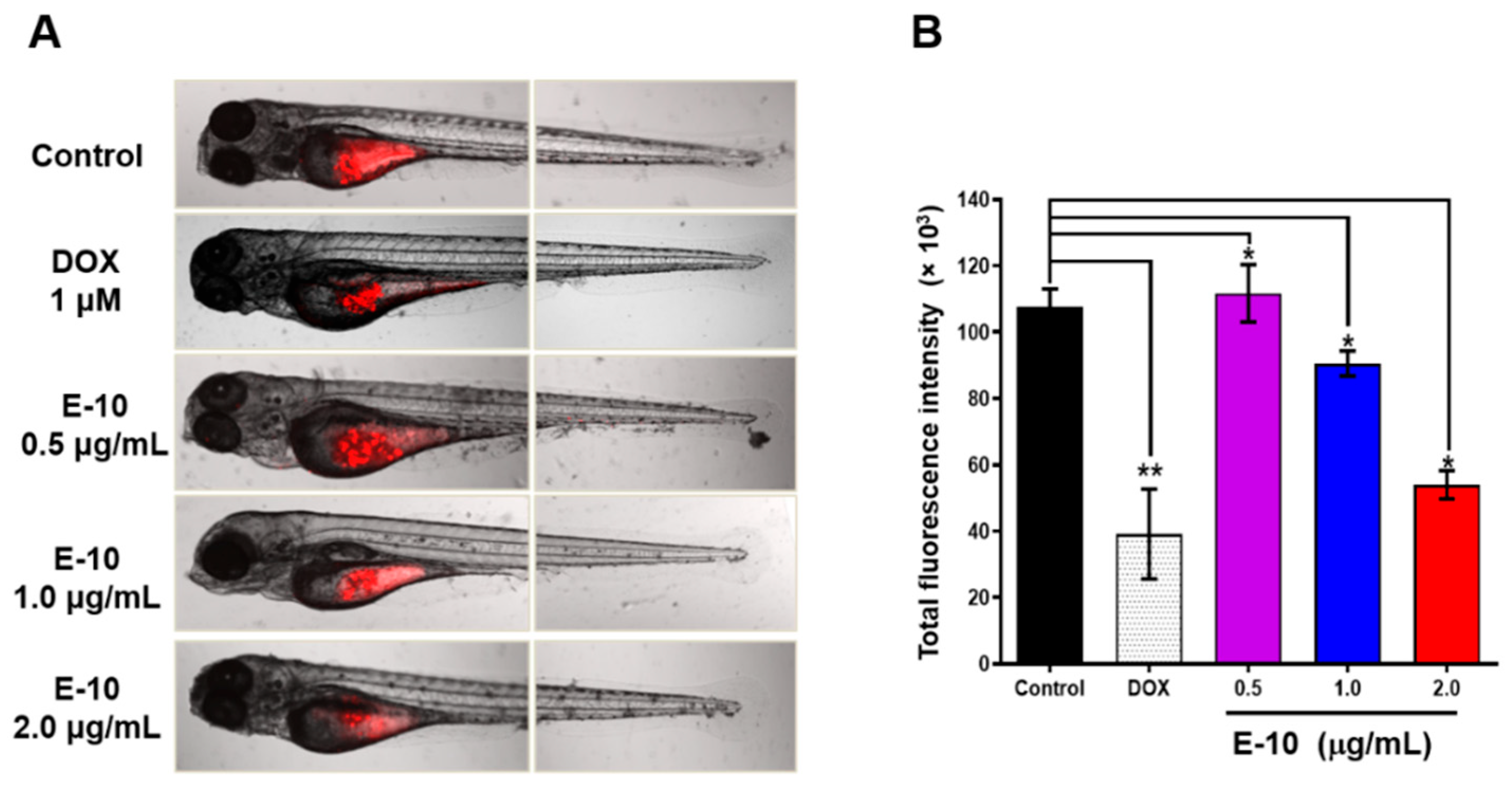 4.5. Anticancer Activity in Zebrafish Models