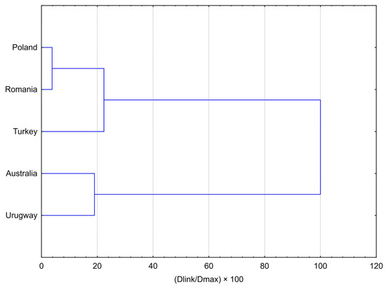 The results of the Hierarchical Cluster Analysis (HCA), presented as a dendrogram and agglomeration schedule (Figure 1), clearly demonstrate a strong clustering of propolis samples according to their geographical origin. Two major, distinctly separated clusters were identified. The analysis identified a broad European cluster, within which Polish and Romanian samples formed a very tight subcluster, reflecting their strong chemical similarity (linkage distance: 100.125). The more distinct Turkish sample subsequently joined this subcluster at a much greater distance (584.419), forming the final Eurasian grouping and highlighting its different chemotype. The non-European cluster consisted of the Australian and Uruguayan samples, which clustered together at a linkage distance of 495.405. The clear separation between these two principal groups was further confirmed by the final merging step at the highest linkage distance (2608.601), highlighting the fundamental differences in the chemical profiles of European propolis compared with samples from other continents.