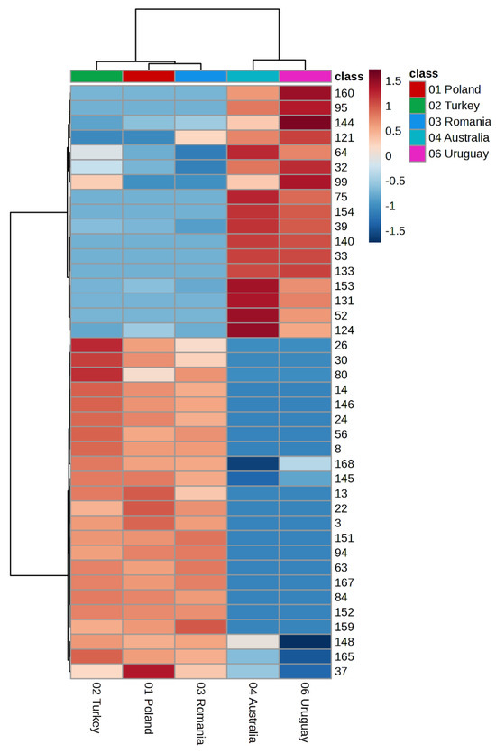 Hierarchical cluster analysis presented as a heatmap (Figure 2) clearly indicates a distinct grouping of propolis samples according to their geographical origin. The European samples (Poland, Romania, Turkey) formed a compact cluster characterized by a high contribution of aromatic compounds. In contrast, the non-European samples (Australia and Uruguay) formed a separate branch of the dendrogram, distinct from the European cluster, highlighting their unique terpene-rich chemical profiles. The pronounced differences in colour intensity reflect marker compounds that determine the regional specificity of the individual samples.