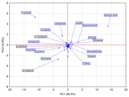 PC1 (56.5% of variance) clearly separated the samples according to their dominant chemical type. European propolis (Poland, Romania, Turkey) clustered on the positive axis, strongly associated with aromatic compounds such as benzoic acid, benzyl alcohol, and vanillin, confirming their role as key markers of poplar-type propolis. Non-European samples (Australia, Uruguay) clustered on the negative axis, driven by high terpene content.