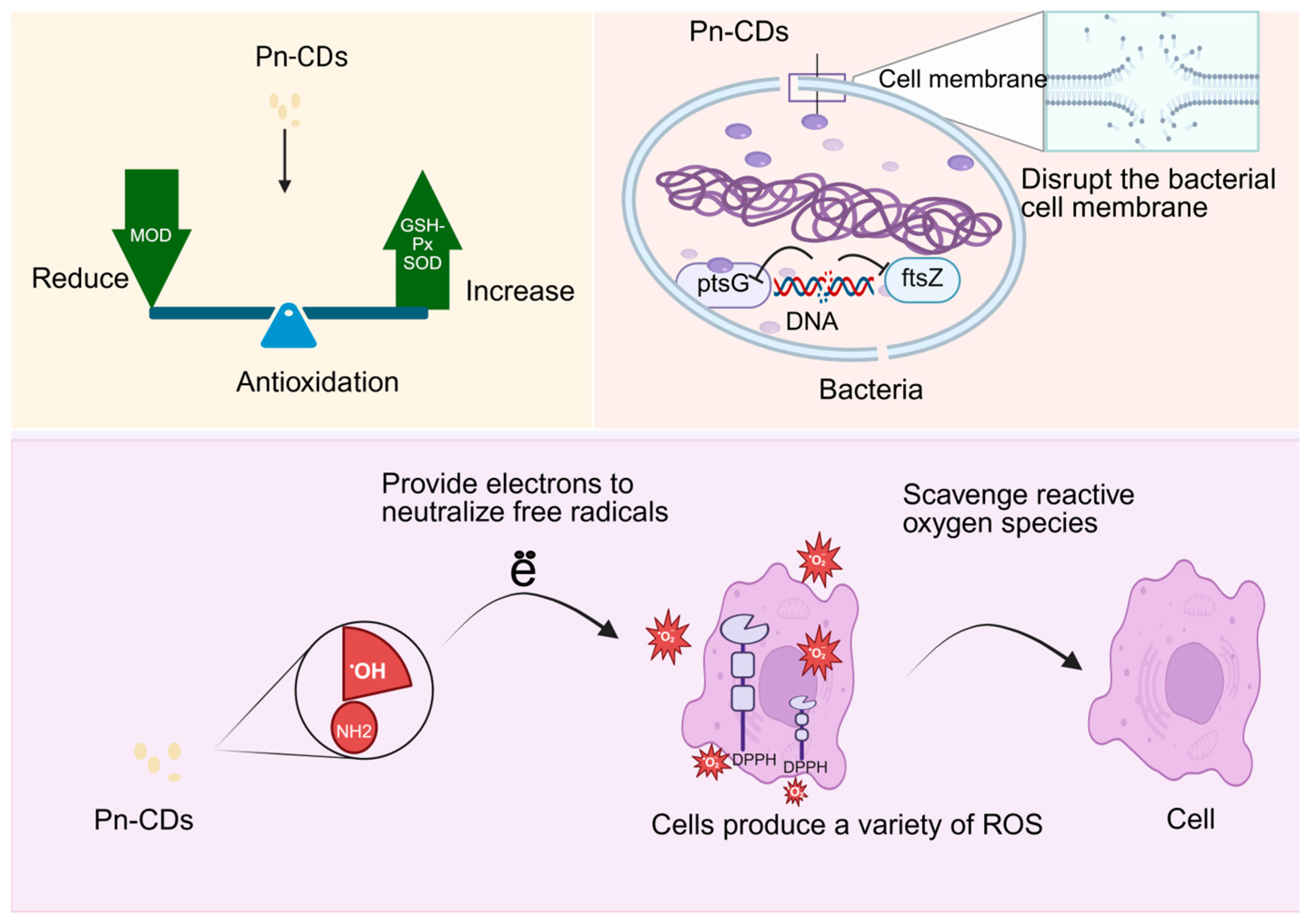 - Wang, H.; Sun, S.; Zhao, Y.; Wang, P.; Zhou, Y.; Sun, H.; Yang, J.; Cheng, K.; Li, S.; Lin, H. Carbon Dots with Integrated Photothermal Antibacterial and Heat-Enhanced Antioxidant Properties for Diabetic Wound Healing. Small 2024, 20, e2403160. [Google Scholar] [CrossRef] [PubMed]