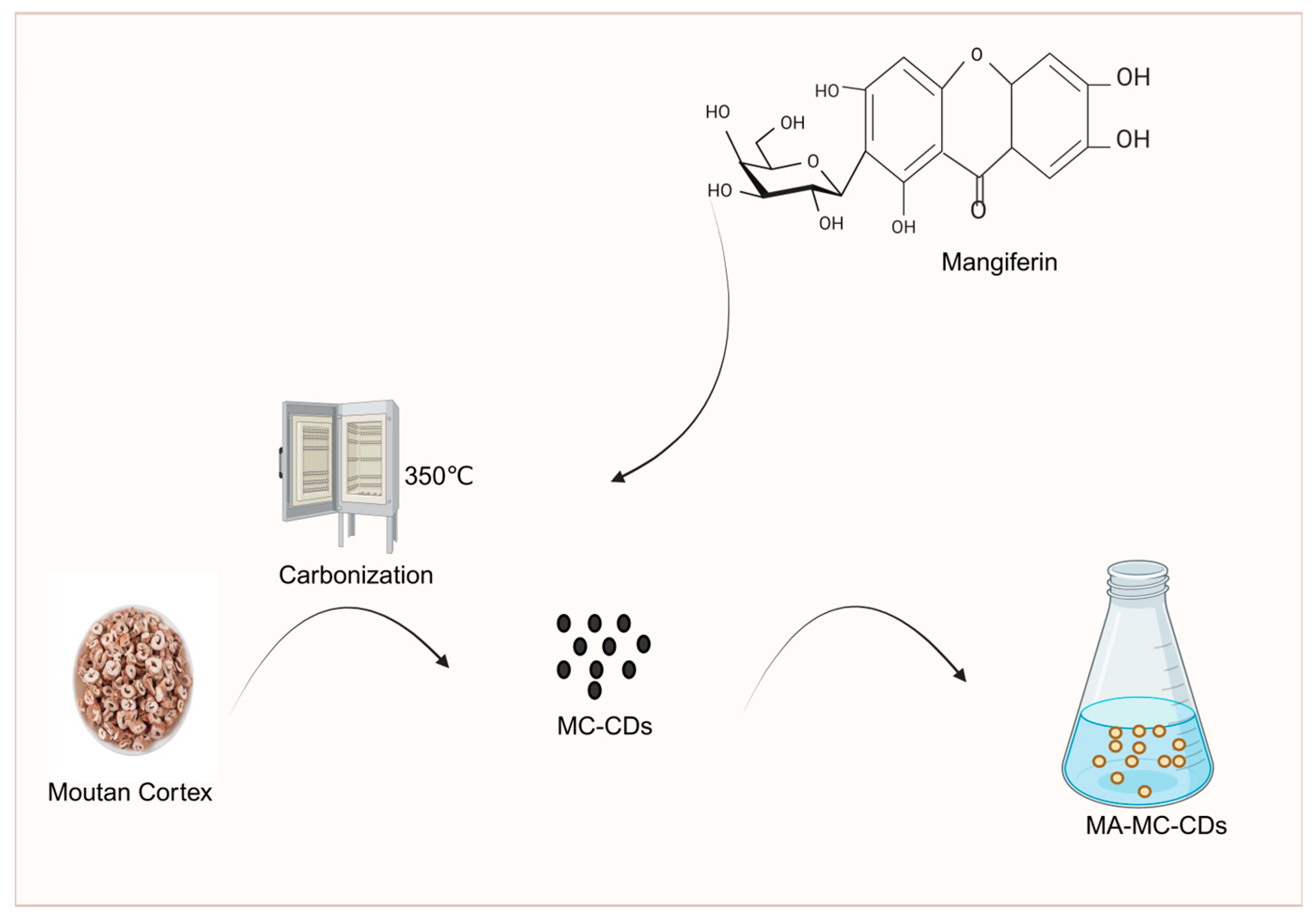 - Kong, C.; Wang, K.; Sun, L.; Zhao, H.; Wang, T.; Zhou, W.; Wu, D.; Xu, F. Novel Carbon Dots Derived from Moutan Cortex Significantly Improve the Solubility and Bioavailability of Mangiferin. Nanomedicine 2024, 19, 3611–3622. [Google Scholar] [CrossRef] [PubMed]