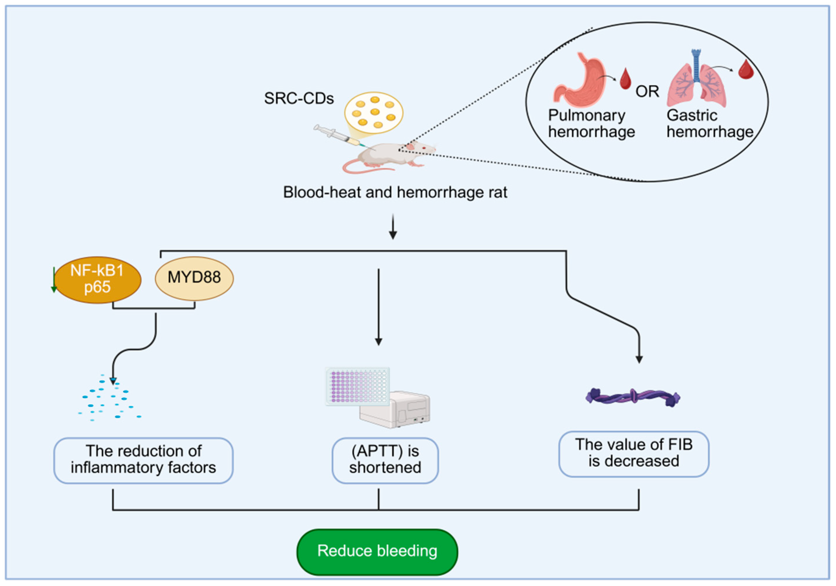 - Zhang, M.L.; Cheng, J.J.; Luo, J.; Li, C.; Hou, T.; Zhao, Y.; Wang, Y.; Qu., H.; Kong, H. Protective effects of Scutellariae Radix Carbonisata-derived carbon dots on blood-heat and hemorrhage rats. Front. Pharmacol. 2023, 14, 1118550. [Google Scholar] [CrossRef] [PubMed]