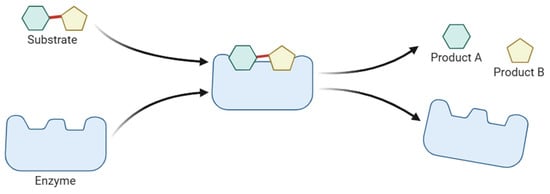 Enzymes are specialised proteins that act as biocatalysts, accelerating chemical reactions by lowering the activation energy required. They are primarily derived from biological sources, such as plants, animal tissues and microbes [4,5], which makes them inherently biodegradable and non-toxic. A key feature of enzymes is their high specificity, enabling them to interact with a particular substrate to convert it into a new molecule. This degree of selectivity minimises side reactions and reduces the production of unwanted by-products [6]. Enzymatic reactions typically occur under mild conditions, such as lower temperatures and neutral pH, which can result in significant energy savings and reduced environmental impact [5]. These characteristics have led to widespread adoption of enzymes in various industrial sectors. Figure 1 provides a schematic representation of enzymatic catalysis, illustrating the specific interaction between enzyme and substrate.