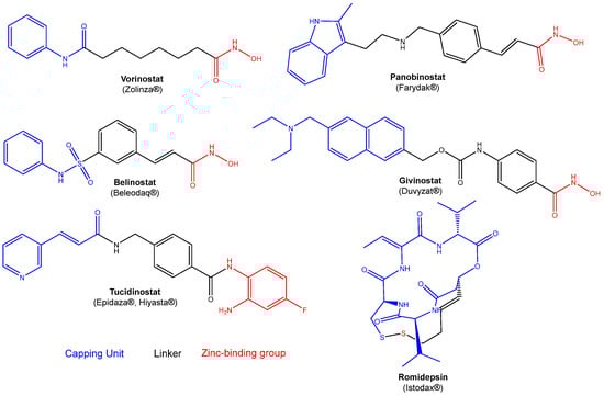Regulatorily approved HDAC inhibitors with their structural features. The capping unit (blue) is connected to the zinc-binding group (red) via the carbon linker (black).