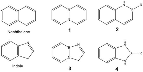 - Dewar, M.J.S.; Dietz, R. 546. New heteroaromatic compounds. Part III. 2,1-Borazaro-naphthalene (1,2-dihydro-1-aza-2-boranaphthalene). J. Chem. Soc. 1959, 3, 2728. [Google Scholar] [CrossRef]