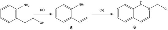 Since direct functionalization at the boron atom is often difficult, we synthesized 2-chloromethyl-2,1-borazaronaphthalene 6 starting with 2-(2-Aminophenyl)ethanol and KOH at high temperature and under vacuum []. The resulting 2-aminostyrene 5 was subsequently converted with potassium trifluoroborate as described by Molander et al. (Scheme 1) [].