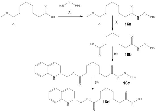 Representative synthesis route for Azaborine-based HDAC inhibitors with hydroxamic acid. (a) Coupling of the protected hydroxylamine (HBTU, DIPEA, CH3CN); (b) deprotection of the carboxylic acid (1. NaOH, 2. HCl); (c) reaction with Azaborine building block 6 (Cs2CO3; CH3CN; 70 °C; (d) deprotection: Pd/C, H2, PTG = Bn.