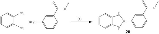 - Davies, G.H.M.; Molander, G.A. Synthesis of Functionalized 1,3,2-Benzodiazaborole Cores Using Bench-Stable Components. J. Org. Chem. 2016, 81, 3771–3779. [Google Scholar] [CrossRef] [PubMed]