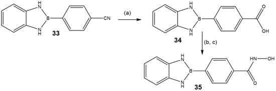 The nitrile 33 was successfully prepared following the procedure depicted in Scheme 4. Subsequent basic hydrolysis yielded the carboxylic acid 34, which was further converted to the hydroxamic acid 35 (Scheme 6) according to the method described above.