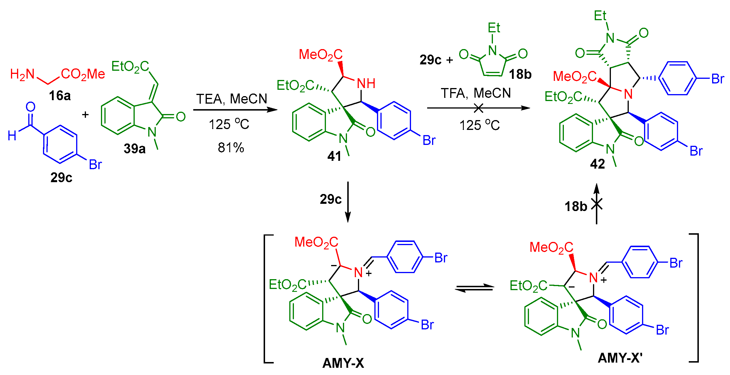 2.1. Double [3+2] Cycloadditions with Stabilized AMYs