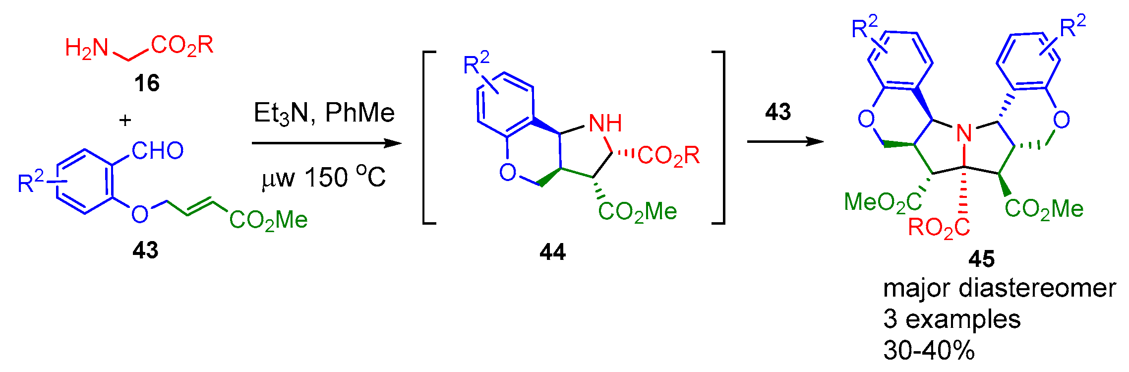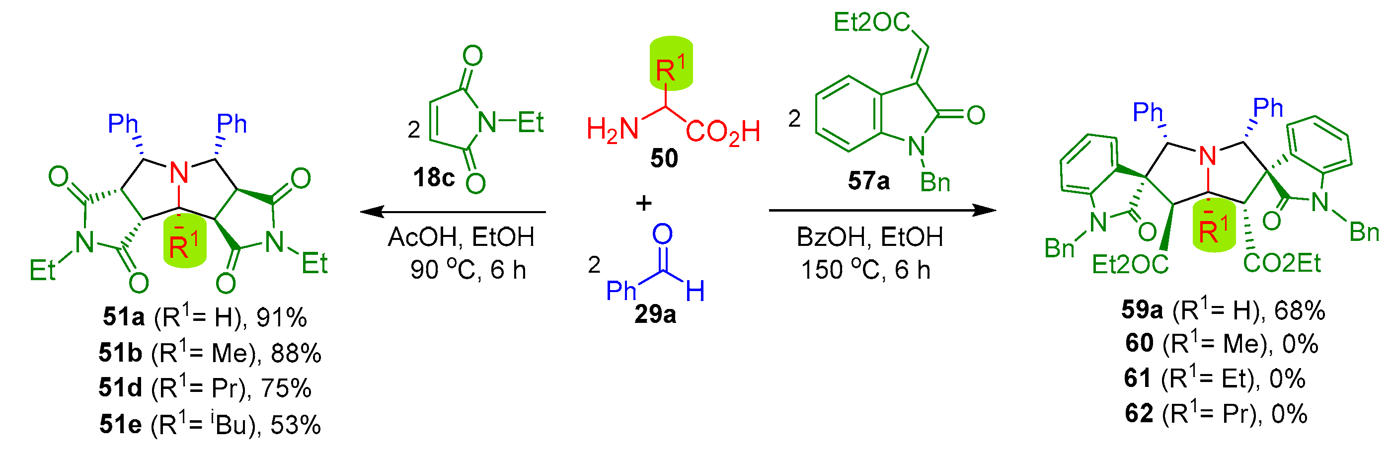 - Zhang, X.; Ma, X.; Zhang, W. Decarboxylative 1,3-Dipolar Cycloaddition of Amino Acids for the Synthesis of Heterocyclic Compounds. Beilstein J. Org. Chem. 2023, 19, 1677–1693. [Google Scholar] [CrossRef]