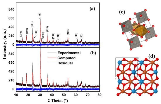 The structural and angular parameters, along with the crystallite size, were determined via Rietveld refinement using the MAUD software (version 2.064), based on the identified monoclinic space group P2/c:1. In Figure 1, the solid black line represents the experimental XRD data, the red line corresponds to the calculated pattern obtained from the Rietveld refinement, and the blue line indicates the difference (residual) between the experimental and calculated intensities. The refined crystallographic parameters, lattice constants, and reliability factors are summarized in Table 1.