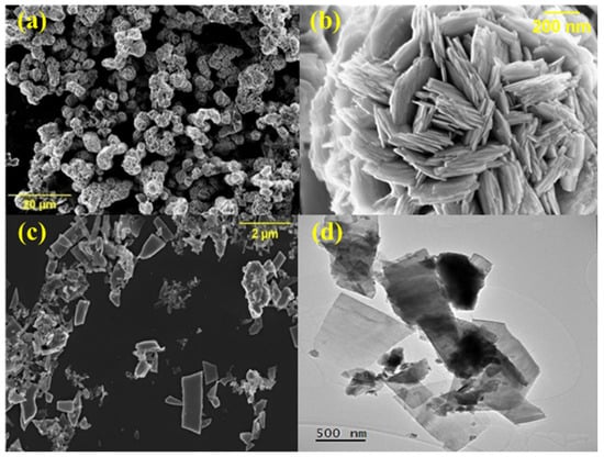 Figure 2 presents the morphological characterization of the ferberite samples, which exhibit self-organized desert rose-like structures and isolated nanoplatelet morphologies. These features were analyzed by scanning electron microscopy (SEM, images (a)–(c) and transmission electron microscopy (TEM, image (d)). The electron diffraction patterns of the self-organized/platelet morphologies are shown in Figure S1 (TEM, Supplementary Material). The SEM images were acquired at different magnifications to highlight structural details: 1.2 k× for image (a), and 70 k× for images (b) and (c).