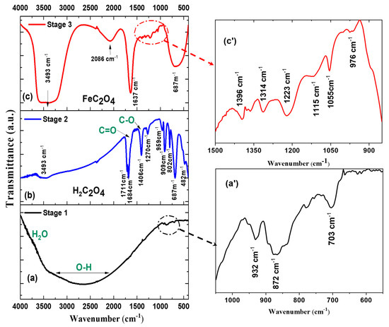 FTIR spectra corresponding to (a) stage 1 (acidification of a sodium tungstate solution to pH 1 with 3 M HCl), (a’) zoom section of spectra (a,b) stage 2 (addition of oxalic acid), (c) stage 3 (addition of iron sulfate heptahydrate) of the synthesis methodology and (c’) zoom section of spectra (c).