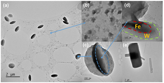 Energy-dispersive X-ray spectroscopy (EDS) confirmed that the amorphous film (Figure 4a) contained approximately 50% W, 40% Fe, and 10% S (oxygen not quantified). The aggregates (Figure 4c,d) exhibited an Fe- and S-rich core surrounded by a tungsten-rich shell, supporting the hypothesis of core–shell-type nucleation followed by interdiffusion processes.