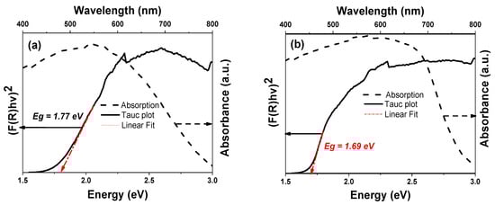 To assess the light-harvesting capabilities of FeWO4 with both distinct morphologies (self-organized vs. isolated platelets), UV–visible diffuse reflectance spectra (DRS) were recorded (Figure 6). Band gap energies (Eg) were estimated using the Tauc relation Equation (S1) (in the Supplementary Materials).