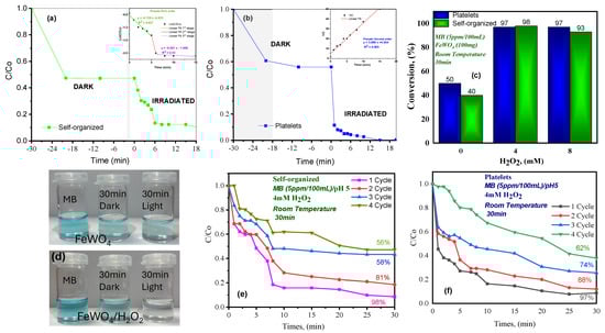 Photocatalytic degradation of MB at pH 5 with 4 mM H2O2: (a) self-organized microstructures, and (b) platelet morphology. Inserts: corresponding kinetic model fits, respectively, for self-organized (insert (a)) and platelet morphology (insert (b)). (c) Effect of H2O2 concentration on MB degradation. (d) Photograph color change in MB solution, after adsorption–desorption equilibrium and after 30 min of irradiation recyclability tests of (e) self-organized and (f) platelets samples.