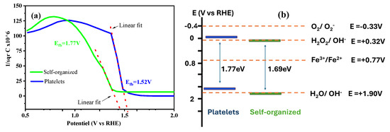 As mentioned above, morphology has a direct impact on catalytic performance. Compared to the self-organized structure, the platelet morphology features larger crystallites (87 nm) and higher crystallinity. This is confirmed by the narrower diffraction peaks in the XRD pattern (Figure 1b), contrasting with the smaller crystallites (68 nm) found in the self-organized morphology. Consequently, platelets have a larger specific surface area, creating a greater number of active surface sites and a larger light absorption cross-section than self-assembled samples. Additionally, the larger surface area and pore volume of the platelets promote better adsorption of methylene blue (MB), improving the diffusion of H2O2 and O2. This results in the greater exposure of active sites, and the localized generation of OH• radicals. Furthermore, the platelet morphology has a more negative conduction band potential of –0.05 V (as detailed in Section 2.7). This property, combined with a higher photocurrent, ensures greater availability of charge carriers, which effectively promotes the reduction of H2O2 to OH• radicals. This explains the superior degradation activity observed under acidic conditions, even when the catalyst surface is positively charged.
