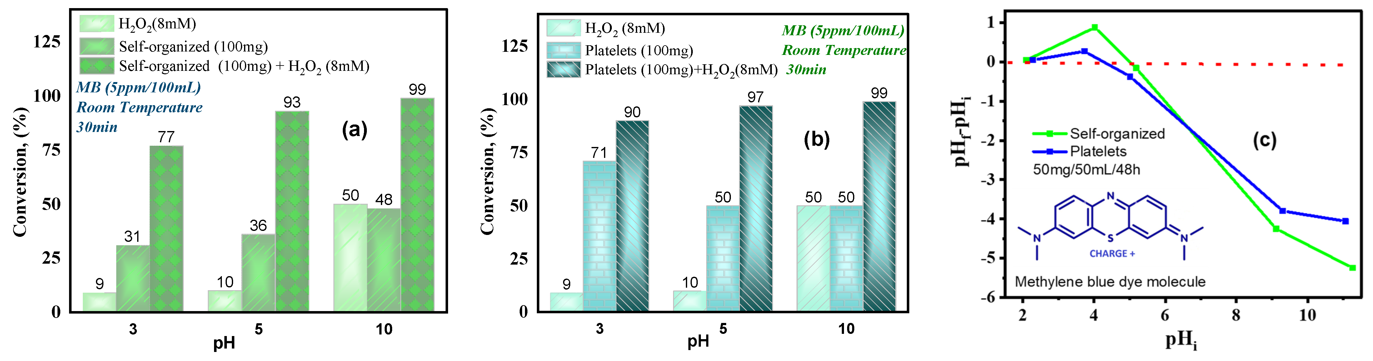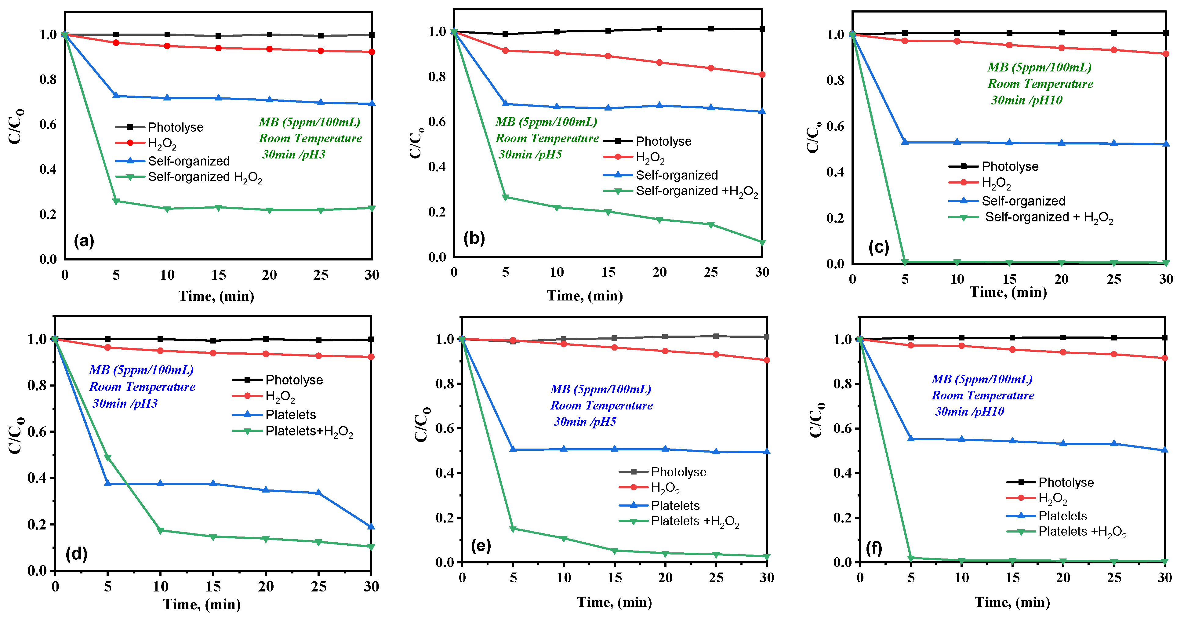 2.6.2. Influence of pH and H2O2 on MB Degradation