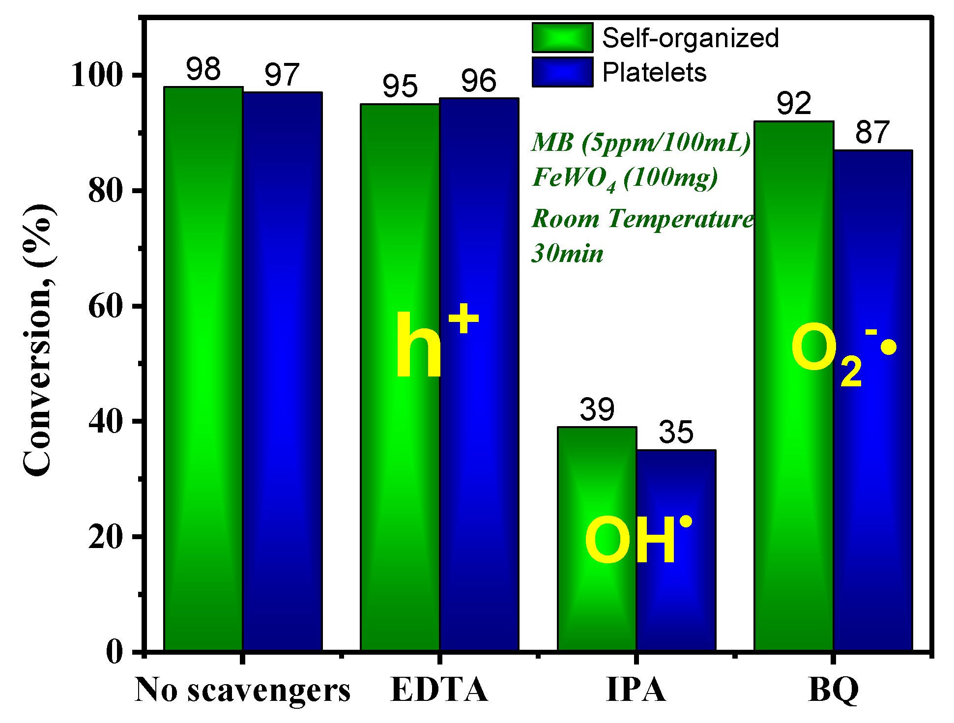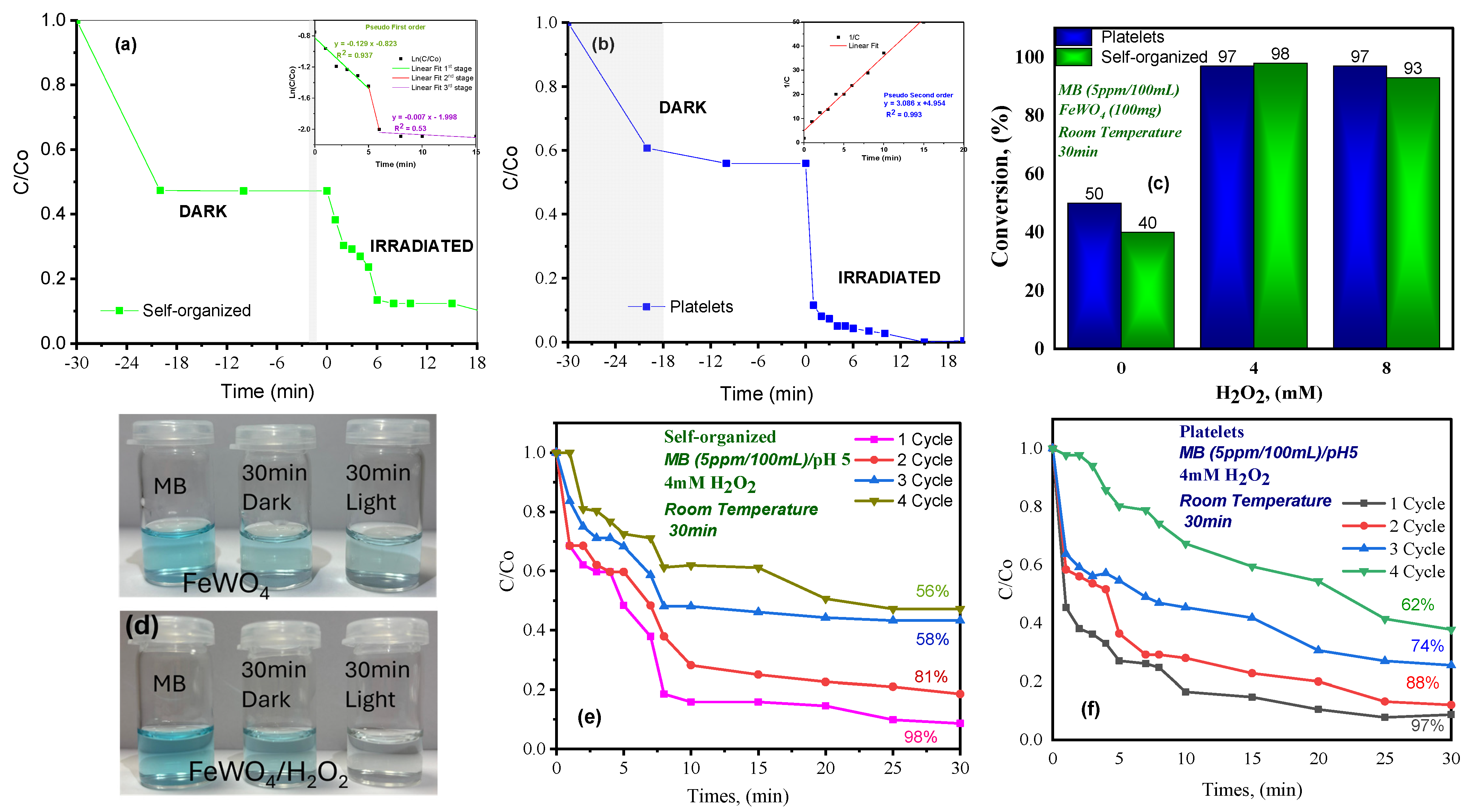 - Blank tests under visible light (photolysis, H2O2 alone, FeWO4 alone)