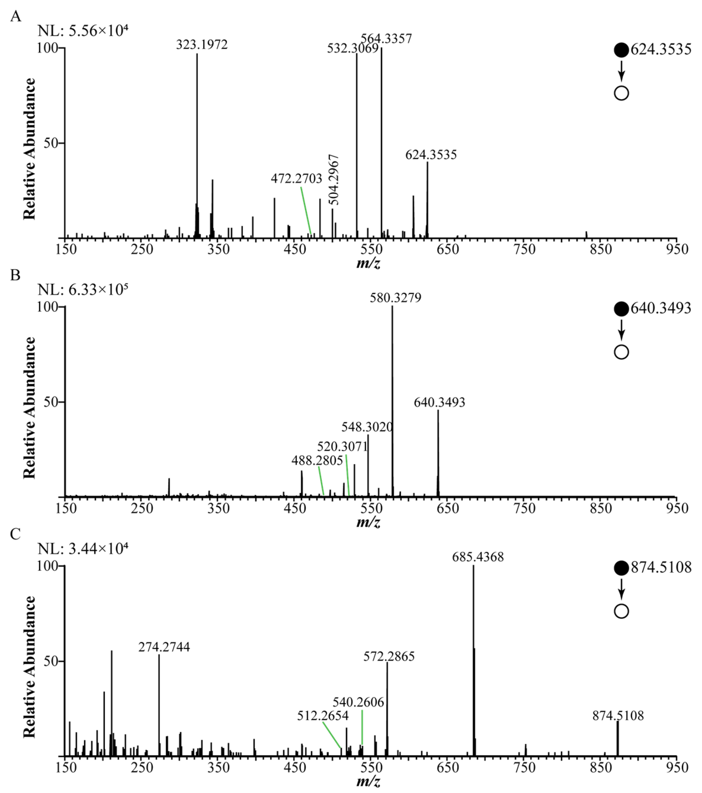 24 | C50H75NO10 | 852.5250 | 0.7 | 572.2859, 540.2600, 512.2650 | 8-palmitic-benzoylmesaconine | [44] | |