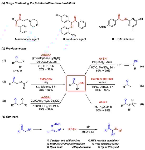 β-Keto sulfides are widely found in nature and demonstrated significant potential in the field of medicinal chemistry. These compounds have long served as essential precursors in the synthesis of biologically active molecules [,]. Among various sulfur-containing compounds, β-keto sulfides represent a crucial class of bioactive molecules that exhibit diverse pharmacological properties. As potent anti-cancer and anti-tumor agents, β-keto sulfides can suppress tumor cell proliferation through specific interactions with biological macromolecules such as proteins and enzymes (Figure 1a(A)), or by interfering with the cell cycle and promoting apoptosis (Figure 1a(B)) []. Furthermore, β-keto sulfides are capable of inhibiting viral replication by modulating key enzymatic activities involved in the process, such as serine proteases, thereby preventing viral spread (Figure 1a(C)) []. Moreover, β-keto sulfides can function as acyl transfer reagents participating in the acetylation of proteins, a process that thereby closely modulates various intracellular pathways associated with the pharmacological efficacy of drugs within human body []. Therefore, the development of simple methods for the synthesis of β-keto sulfides with diverse functional groups is of great significance.