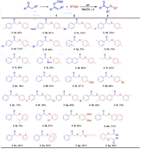 Thus, the optimal conditions for the reaction of 1-phenyl-1-trimethylsiloxyethylene (1a) with p-methylphenylthiol (2a) are as follows: MeOH as solvent, 2.0 equiv. of 2a, open to air, 1 h at ambient temperature.