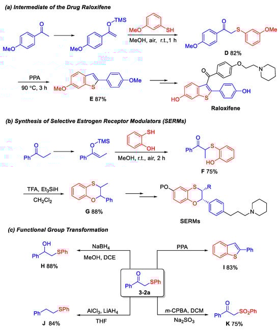 Raloxifene is a prescription medication indicated for the prevention and treatment of osteoporosis. It reduces the risk of osteoporotic fractures by inhibiting bone resorption and enhancing bone mineral density (BMD). Selective estrogen receptor modulators (SERMs) are capable of selectively binding to estrogen receptor α (ERα), thereby modulating estrogenic activity and ameliorating conditions associated with estrogen deficiency. This experimental methodology enables the facile synthesis of intermediates for the pharmaceutical agent Raloxifene (Figure 3a) [,,], and selective estrogen receptor modulators SERMs (Figure 3b) [,]. Moreover, through a series of straightforward functional group transformations, as illustrated in Figure 3, compound 3-2a can be readily converted into various valuable derivatives, such as the β-hydroxy sulfide H, thiophene ring I, thioether J, and sulfone K (Figure 3c) [,,].
