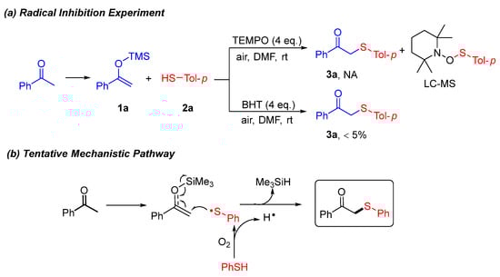Subsequently, a series of mechanistic experiments were conducted to elucidate the formation pathway of β-keto sulfides (Figure 4a). First, upon introduction of TEMPO (4 equiv.) under standard reaction conditions, no desired product was observed, and LC–MS analysis revealed the formation of a phenylthiyl radical adduct (see figure titled “Radical inhibition experiment” in the Supplementary Materials). Similarly, the reaction was markedly inhibited upon the addition of BHT under standard reaction conditions, suggesting the possible involvement of radical intermediates in the reaction process. Based on the aforementioned experimental results and prior research, we propose a plausible reaction mechanism for this transformation (Figure 4b). Radical trapping experiments offer compelling evidence that the reaction proceeds via a radical-based mechanism. The proposed reaction mechanism is as follows. Thiyl radicals were generated under an air atmosphere from thiols [],which couped with 1-phenyl-1-trimethylsiloxyethylene (1a) leading to the cleavage of the double bond and the formation of the target product with the elimination of the trimethylsilane.