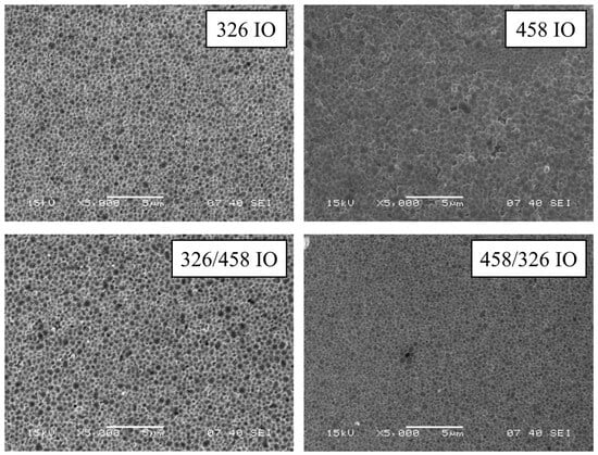 UV–visible spectroscopy was performed in reflectance mode (Figure 3). The IOs are compared to anatase powder to better represent the optical properties. All IOs show an absorption edge, which is due to the TiO2 semiconductor band gap. The absorption edge of the 458 IO and 326/458 IO shifted blue by 20 nm. The 326/458 IO’s absorption edge also shifted around 40 nm, while the 326 IO shows lower absorbance. The photonic band gap is one of the properties that arises from the IO structure. The 458 IO has it around 560 nm, which is close to one of our own earlier findings [10]. Double IOs also show a photonic band gap around 510 nm, while in the case of the 326 nm IO this is not that pronounced. The absorption enhancement due to the “slow” photon effect is also visible for the 458 nm IO right before and after the absorption edge at 435 nm and at 710 nm. For the double IOs, the slow photon areas are around 410 nm and 590 nm. The 326 nm IO shows an absorption increase starting from 510 nm to 1000 nm. The IO with 326 nm void size would have a photonic band gap from 400 to 500 nm. The precise enhancement of the IO’s blue and red edges depends on the structure: the order is 326/458 IO, 458 IO and 458/326 IO, where the absorbance is 0.17, 0.11 and 0.06, respectively. For the red edge, the order is 326/458 IO, 458 IO and 458/326 IO, where the absorbance is 0.10 (600 nm), 0.05 (715 nm) and 0.03 (580 nm), respectively. The 326 IO also has an increase in absorption from 510 nm, which is around 0.08.