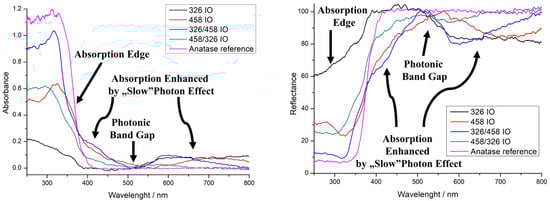 UV–vis spectra of the inverse opals (IOs), absorbance (left) and reflectance (right).