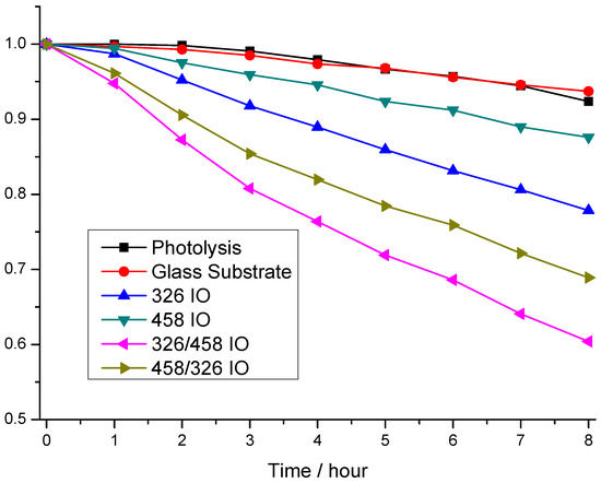 Rhodamine 6-G photodegradation experiments show the photocatalytic activity of the samples (Figure 4). The model pollutant photodegrades after 8 h of irradiation, but it is just around 8.0%. Interestingly, the glass substrate makes this worse (6.3%). The photocatalytic efficiency measurements show that the order of activity is 326/458 IO, 458/326 IO, 326 IO and 458 IO, where the photocatalysis degraded 39.6%, 31.0%, 22% and 12.5%. From these results, all IOs possess photocatalytic properties; moreover, the stacked IOs proved to be more efficient. Interestingly, the 326 IO shows better efficiency than the 458 IO; this can be explained by the higher specific surface area from the smaller, ~326 nm nanospheres. Also, the 326 IO has a significant absorbance in the visible region from 510 nm, which proves to be more effective than the absorption enhancement of the 458 IOs. Looking at the double IOs, the 326/458 IO proved to be more effective than the 458/326 IO, which goes against the tendency of the single IOs. The cause of this could be that the upper 458 layer provides increased absorbance, while the higher surface area is still retained, but on the opposite effect the absorption enhancement of the 458 IO layer is lost; this is visible on the UV–vis spectra of Figure 3. Interestingly, with this train of thought, the 458/326 IOs performed better compared to the 326 IO This means that the bottom 458 IO layer still improves the 326 IO’s efficiency. The UV–vis spectra show that the 458/326 IO has an increased absorbance close to the absorption edge.