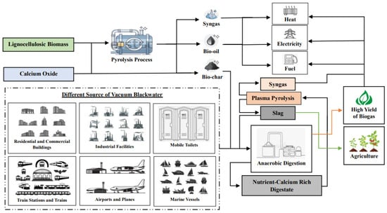 The increasing global population and urbanization have led to significant challenges in waste management, particularly concerning vacuum blackwater (VBW), which is the wastewater generated from vacuum toilets. Traditional treatment methods, such as landfilling and composting, often fall short in terms of efficiency and sustainability. Anaerobic digestion (AD) has emerged as a promising alternative, offering benefits such as biogas production and digestate generation. However, the performance of AD can be influenced by various factors, including the composition of the feedstock, pH levels, and the presence of inhibitors. This review investigates the effects of calcium oxide (CaO)-modified biochar (BC) as an additive in AD of VBW. Modifying BC with CaO enhances its alkalinity, nutrient retention, and adsorption capacity, creating a more favorable environment for microorganisms and promoting biogas production, which serves as a valuable source of heat, fuel and electricity. Additionally, the digestate can be processed through plasma pyrolysis to ensure the complete destruction of pathogens while promoting resource utilization. Plasma pyrolysis operates at extremely high temperatures, effectively sterilizing the digestate and eliminating both pathogens and harmful contaminants. This process not only guarantees the safety of the end products, but also transforms organic materials into valuable outputs such as syngas and slag. The syngas produced is a versatile energy carrier that can be utilized as a source of hydrogen, electricity, and heat, making it a valuable resource for various applications, including fuel cells and power generation. Furthermore, the slag has potential for reuse as an additive in the AD process or as a biofertilizer to enhance soil properties. This study aims to provide insights into the benefits of using modified BC as a co-substrate in AD systems. The findings will contribute to the development of more sustainable and efficient waste management strategies, addressing the challenges associated with VBW treatment while promoting renewable energy production.