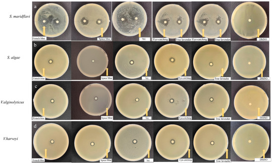 (a) Bacteriostatic effect of five Lavender essential oils against Shewanella maridflavi. (b) Inhibition zone effect of five LEOs against Shewanella algae. (c) Inhibition zone effect of five LEOs against Vibrio alginolyticus. (d) Inhibition zone effect of five LEOs against Vibrio harveyi.