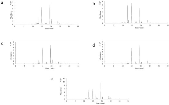 Total ion chromatogram of volatile components in LEOs ((a) French blue LEO; (b) 701 LEO; (c) space blue LEO; (d) eye-catching LEO; (e) true LEO).