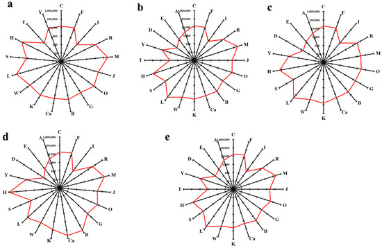 Radar chart of aroma distribution for each essential oil. Note: (a) French blue Lavender; (b) 701 Lavender; (c) space blue Lavender; (d) eye-catching Lavender; (e) true Lavender; each letter represents a different aroma: A—fatty; B—cool; C—citrus; D—frankincense; E—food; F—fruity; G—green; H—herbaceous; I—iris; J—jasmine; K—pine; L—aromatic compounds; M—lily of the valley; N—narcotic; O—orchid; P—phenolic; R—rose; S—spicy; T—toasted; Ve—vegetable; W—woody; Y—earthy; Z—organic solvent; Ca—camphor.