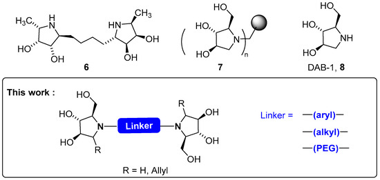 The presence of multiple copies of a given ligand gathered on a unique chemical structure, a phenomenon found in nature to improve host-guest interactions [29,30], is a recent strategy in pharmaceutical research to increase the performances of enzyme inhibitors via the so-called multivalent effect. During the last decade, a major step forward was achieved with multivalent glycosidase inhibitors, culminating in binding enhancement by several orders of magnitude [31,32,33,34,35,36]. Homo-dimeric compounds are the most simple of the series [37,38]. Although they generally display a modest but measurable multivalent effect, dimeric iminosugars remain attractive for mechanistic investigations. For instance, striking results were obtained with dimer 6: kinetic analysis showed a 19-fold increase in the inhibition potency for 6 (IC50 = 0.108 µM) relative to the monomer towards fucosidase (Figure 1) [39]. Moreover, the use of stereoisomers of 6 allowed a detailed analysis of the mechanism of inhibition of such a dimeric structure, at a molecular level. In the same manner, multivalent architectures with general structure 7 based on N-tethered pyrrolidine 8, a natural product named DAB-1, afforded strong inhibitors of α-mannosidase, N-acetylgalactosamine-6-sulfatase, and protein tyrosine phosphatase 1B [40,41,42,43,44]. Resting upon our experience acquired in the field of iminosugar synthesis by using glycosylamines as key intermediates, we aimed to come up with an extension of the method to prepare dimeric iminosugars based on a DAB-1 scaffold (Figure 1). The synthetic sequence exploits bis-glycosylamines as intermediates, which easily allows variation of the spacer (alkyl, aryl, PEG) separating both pyrrolidines by the crucial choice of the starting di-amine.