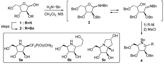 - Chirke, S.S.; Rajender, A.; Rao, B.V. A Divergent Approach for the Synthesis of some Polyhydroxy Pyrrolidines and Piperidines from Ribosylamine. Tetrahedron 2014, 70, 103–109. [Google Scholar] [CrossRef]