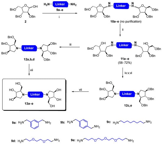 A critical aspect in the design of divalent glycosidase inhibitors is the chemical nature and the length of the linker which separates the two iminosugars. A variety of spacers have been devised in literature, which comprise alkyl, aromatic, polyamino, or PEG chains, each of them requiring specific chemistry for its introduction on the pre-formed pyrrolidine [35,45,46,47,48]. Here, the linker originates from the di-amine that is used to build the bis-glycosylamine, enabling a large variety of possibilities. Thus, in the first series of experiments, we evaluated the reactivity of a series of diamines 9a–e, which feature various chain lengths and structures (Scheme 2). To this aim, each amine was stirred with tri-O-benzyl-l-xylofuranose 2 in dichloromethane in the presence of molecular sieves, following our own methodology for the synthesis of monomeric glycosylamines [7]. However, whereas an excess of amine could be used in the latter case as no competition occurs between mono and bis-glycosylation, the stoichiometry of the reaction has to be carefully controlled here in order to secure the formation of the symmetrical expected bis-glycosylamine by the introduction of the sub-stoichiometric amount of the amine. Fortunately, the reaction proved efficient, whatever the amine used, affording glycosylamines 10a–e as the major compounds. Bis-glycosylation of the amine was confirmed by HRMS with the presence of peaks corresponding to m/z = [MH]+ and m/z = [MH2]2+/2. In some cases, a small amount of the monofunctionalized bis-amine (ie, tethering of only one sugar moiety) was identified in the Mass or NMR spectra. Nevertheless, the crude product was used as such in the next step since purification was not possible at this stage due to the lability of these adducts.