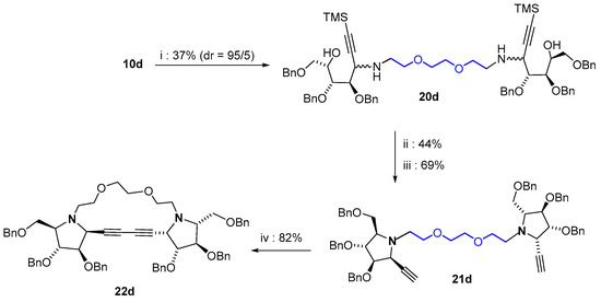 To go even further in the synthesis of macrocyclic structures by using our method, another strategy was designed, which would exploit alkyne/alkyne Glaser-type coupling to form the corresponding diyne (Scheme 4). To this aim, the addition of an ethynyl nucleophile was attempted on glycosylamine 10d. Whereas acetylide (via the corresponding Grignard) afforded unsatisfactory results TMS-acetylide was added selectively to 10d (d.e. = 90%), affording the expected bis-amine 20d in 37% yield. Here, the (S) configuration was attributed to the newly formed stereocenters according to NOESY experiments conducted on the TMS-alkyne after cyclization, which is the opposite of that observed for the allyl-analogue. After the standard intramolecular nucleophilic substitution protocol mediated by MsCl, trimethylsilyl groups were removed (TBAF) to afford the bis-ethynylpyrrolidine 21d. Gratifyingly, treatment of 21d with copper(II) acetate monohydrate and nickel chloride to promote intramolecular diyne coupling afforded glycophane 22d in 82% yield [51]. At this point, no tentative was made to debenzylate further 22d.